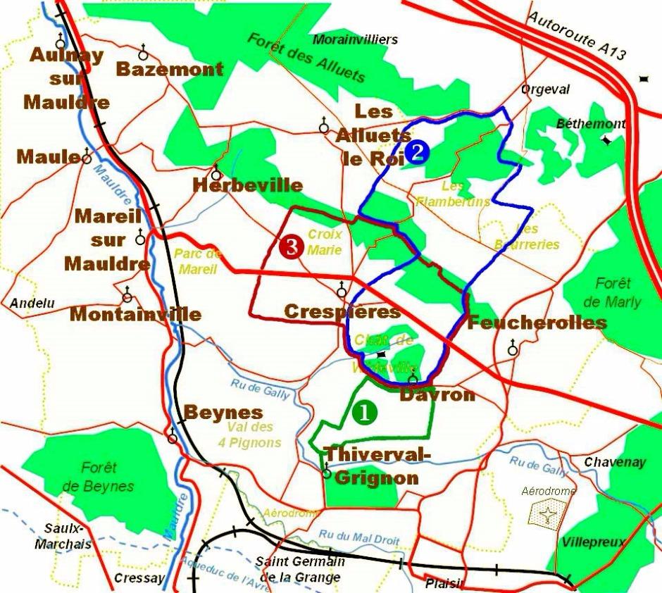 Randonnée dite des trois châteaux. Prendre le GR1 au départ de la place de l’église en longeant le cimetière, lorsque le GR1 tourne à gauche, le quitter. Poursuivre tout droit entre champs en empruntant le PR de Crespières, suivre le mur du parc de Wideville sur le PR. Passer un petit pont sur le ru Ziguemberg qui coule sous un très vieux tilleul. Continuer jusqu'à Crespières. Suivre les balises jaunes des Chemins de Gally, dans Crespières, jusqu'à l’église. Observer le portail Roman, prendre la rue Saint Martin puis la ruelle des Bourbiers à gauche pour rejoindre le « Relais des randonneurs ». Observer le très beau tilleul sur la placette de la Libération, planté en 1945. Prendre la rue de la Sansonnerie, puis le PR à droite à la poste située rue de Moncel. Prendre à gauche rue du Poteau Logé, puis rue du Chêne que l’on quitte en face vers l’ouest par le Vieux Chemin de Maule. Au croisement prendre à droite et traverser prudemment la D307. Continuer le long d’un verger, traverser la route d’Herbeville et prendre en face une petite voie à l’est du château de Boulemont. Puis prendre à gauche en montée vers le plateau des Alluets-Le-Roi. Suivre le PR à droite par le « Chemin du moulin de Pierre » jusqu'à la D198. Le prendre à droite sur 100 m, puis tourner à gauche vers la clairière. Continuer entre bois et champ jusqu’au PR. Prendre alors à gauche pendant 250 m. A la barrière de la forêt des Flambertins, prendre la grande allée sur la droite et 500 m plus loin, passer à droite sur un petit pont de pierre. Suivre le « Chemin des pierres meulières ». Rejoindre le parking de la forêt des Flambertins, et prendre vers le sud, après 100 m tourner à gauche. Suivre le PR vers le sud-est, le laisser pour prendre à gauche le long du champ et entrer dans le bois de Villiers, le chemin oblique à droite puis à gauche pour aboutir à la mare de Villiers. A la sortie du bois prendre à droite jusqu’au carrefour des Lions. Prendre le chemin descendant sur la droite sur le GR1. Puis traverser la D307 pour revenir sur Davron. (Réf. : Les Chemins de Gally, A.P.P.V.P.A, Guide des randonnées de la plaine de Versailles).