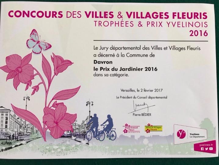 Valérie Pierres et Xavier Vaillant ont représenté la mairie de Davron le jeudi 2 février pour recevoir la distinction "1 pétale" ainsi que le prix du jardinier 2016 décernés par le jury départemental des Villes et Villages Fleuris.