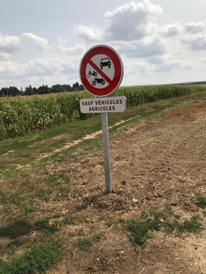 Nous en avons profiter également pour installer de nouveaux panneaux de limitation de vitesse (70km/h avant le virage et l'entrée dans Davron) et d'interdiction de circuler (sauf riverains et engins agricoles) sur certains chemins communaux (chemin aux boeufs, chemin vert, chemins au départ de la Croix St Jacques).