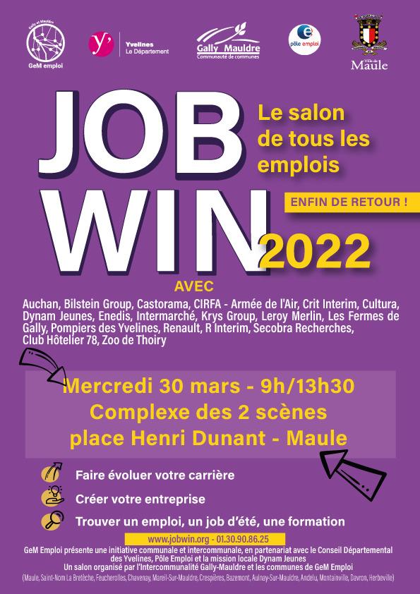 Le salon de l’Emploi Jobwin, organisé par GeM Emploi (Gally et Mauldre Emploi), aura lieu à Maule le mercredi 30 mars de 9h00 à 13h30. De nombreuses entreprises seront présentes pour proposer des centaines d’emplois de tous les types CDD, CDI, jobs d’été, stages, alternances… Parmi celles-ci Auchan, Castorama, Intermarché, Burger King, Krys Group, Renault, Cultura, Veolia, Bilstein Group, Ministère de la Défense, Police Nationale, Enedis, Pompiers Yvelines/SDIS, Secobra Recherches, Zoo de Thoiry, ADMR, R Interim, Dynam'Jeunes, IAD France, Les Fermes de Gally, BGE, Club Hôtelier 78, Abalone, Partage&Vie, Initiative Seine Yvelines…